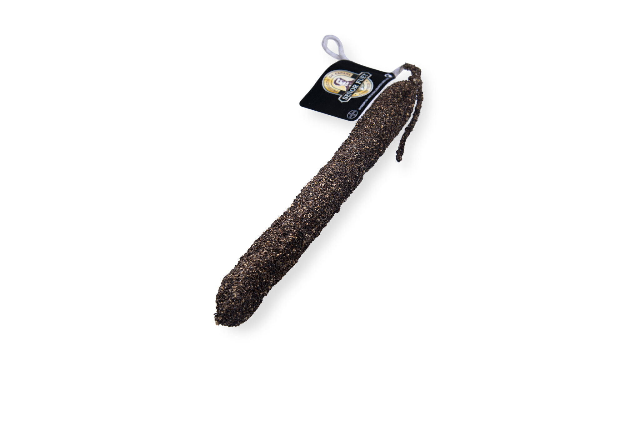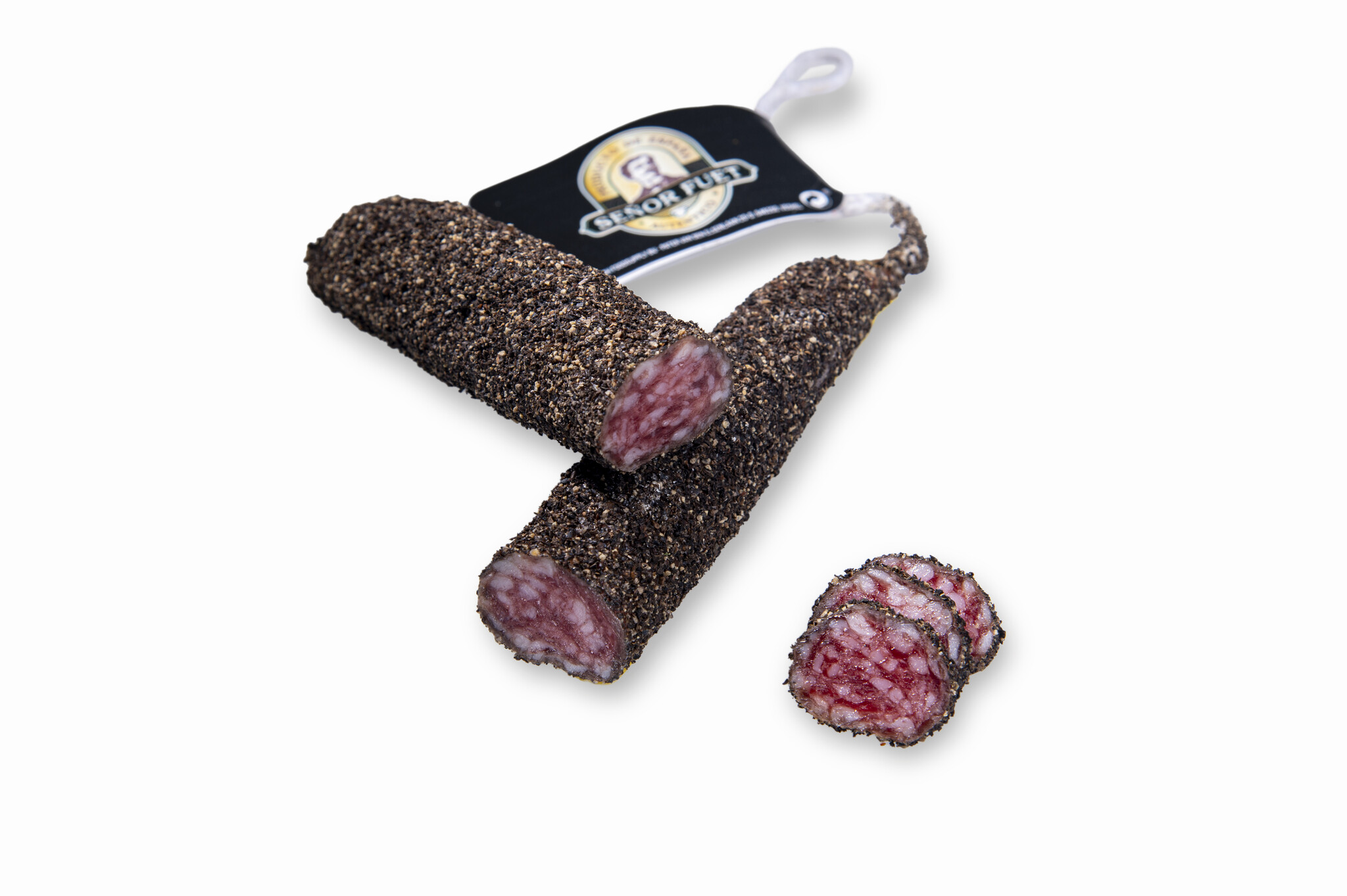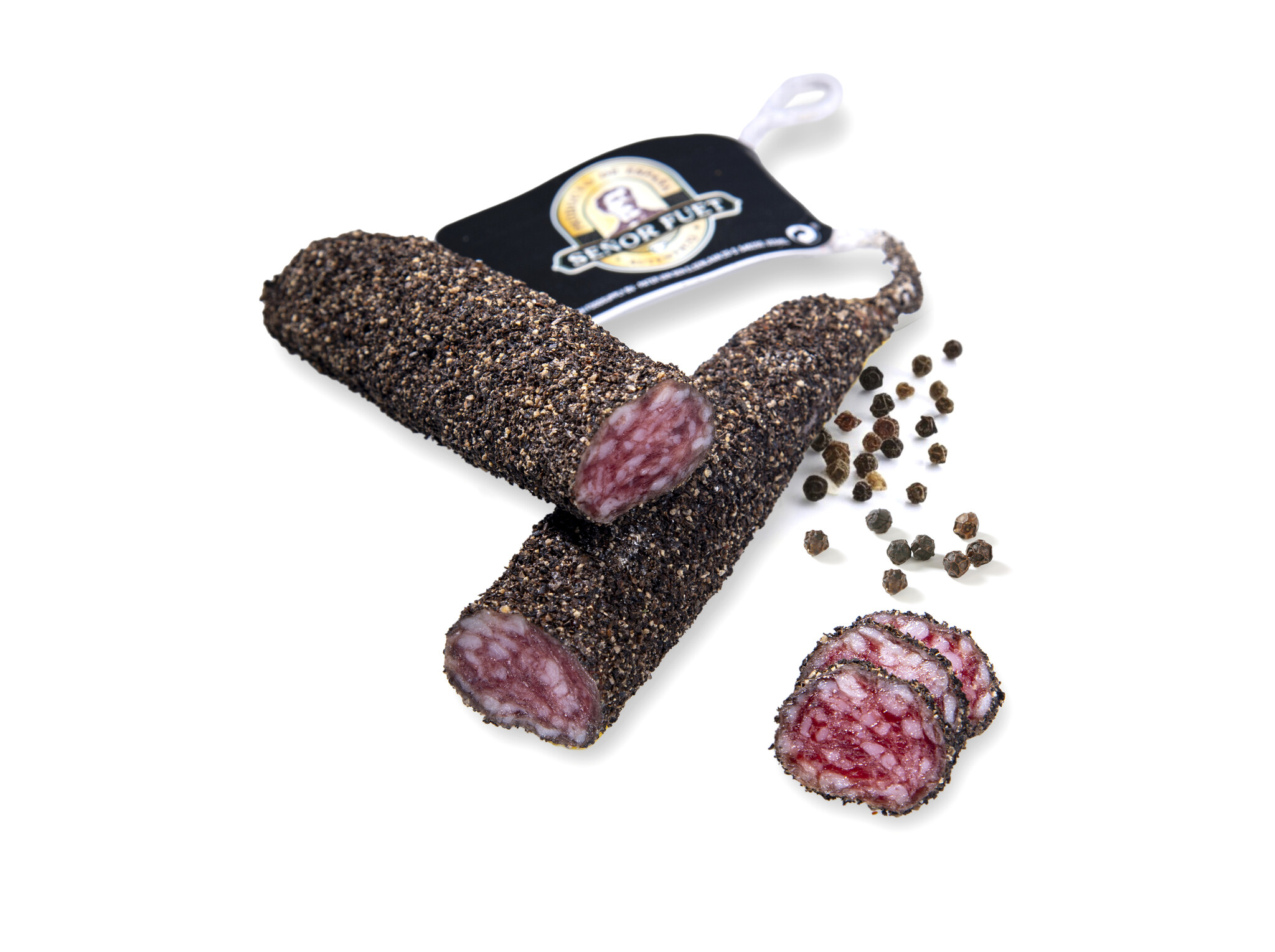 Natuurlijke Spaanse fuet omhuld met peper. Gemaakt in Catalonië. Anders dan bij de meeste worsten, heeft deze fuet een coating van peper. De peper geeft de droge worst direct een kruidige en pittige smaak. Een klassieke toevoeging voor het assortiment.